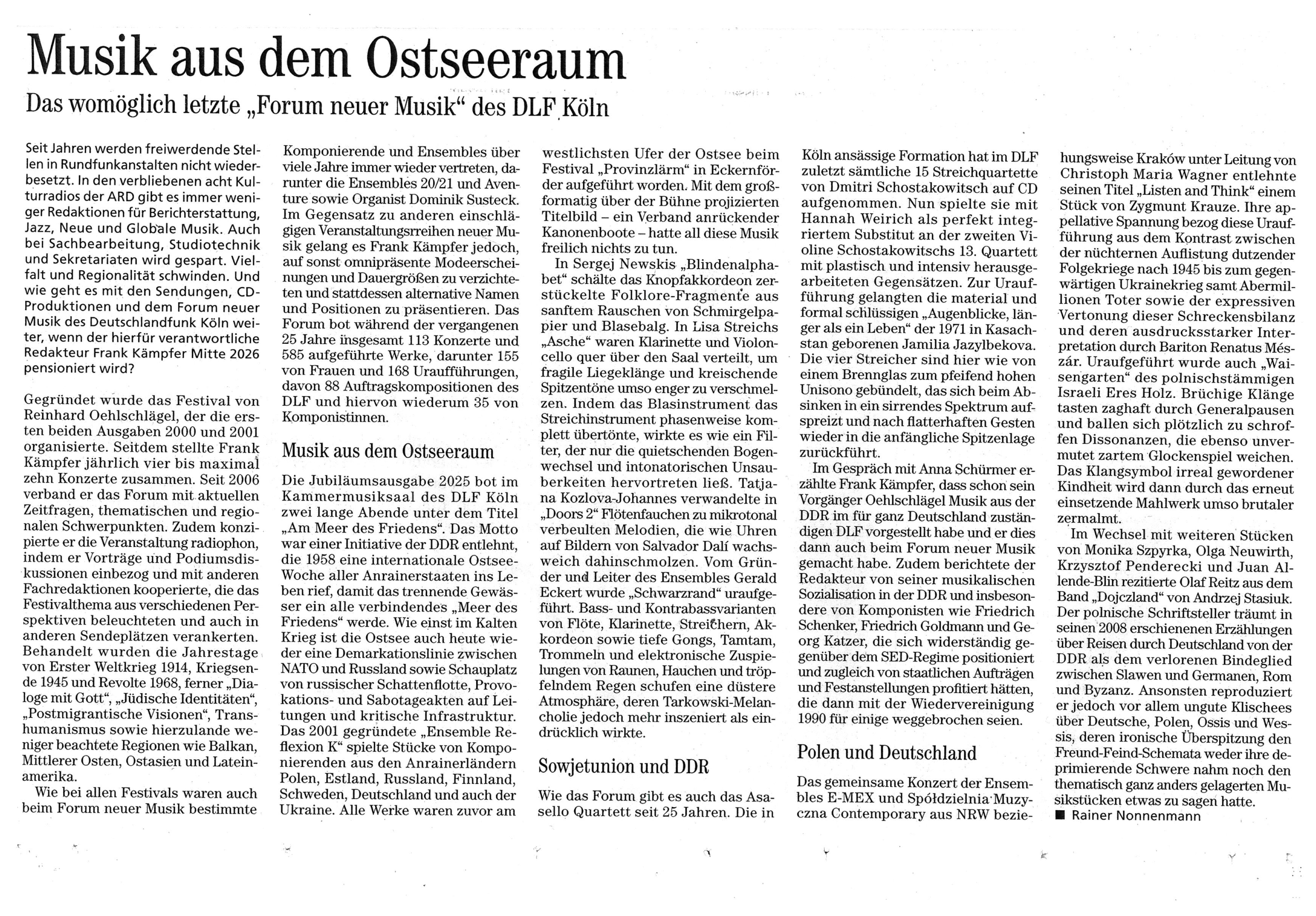 Also premiered was Waisengarten by the Polish-born Israeli Eres Holz. Fragile sounds cautiously probe through rests and suddenly accumulate into harsh dissonances, which unexpectedly give way to delicate glockenspiel. The sonic symbol of a surreal childhood is then brutally crushed by the grinding mill that resumes once again.